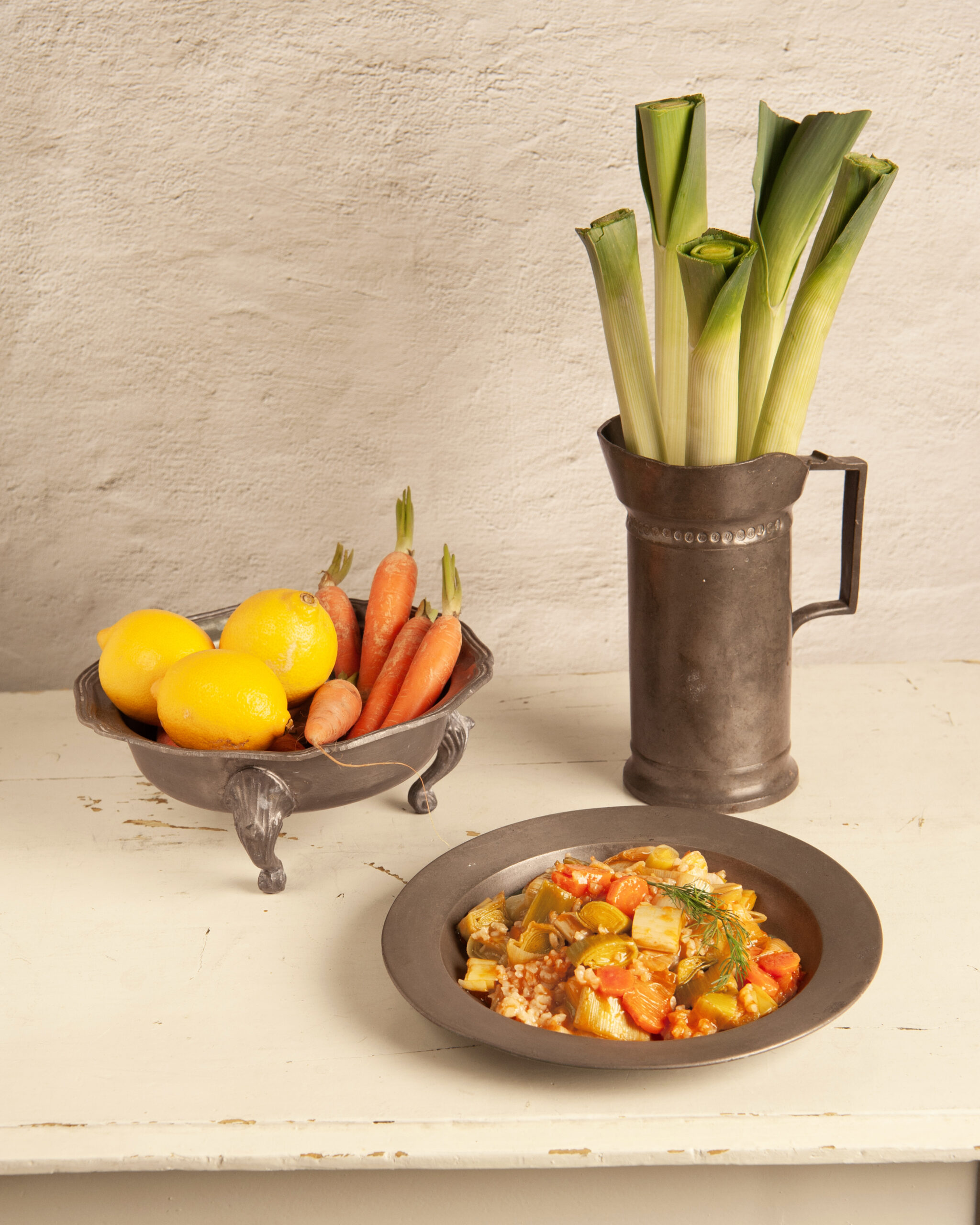 Nienke: “Onze insteek was een aantrekkelijke compositie door props zorgvuldig uit te kiezen op vorm en kleur, maar zonder het te ‘chique’ te stylen. We gebruikten witte of crèmekleurige borden en een houten ondergrond om de rust te bewaren. We wilden namelijk dat de fotografie de eenvoud van de recepten zou weerspiegelen. Keep it simple: een mooi uitgelijnde, uitnodigende compositie die toegankelijk is om zelf te gaan maken.”